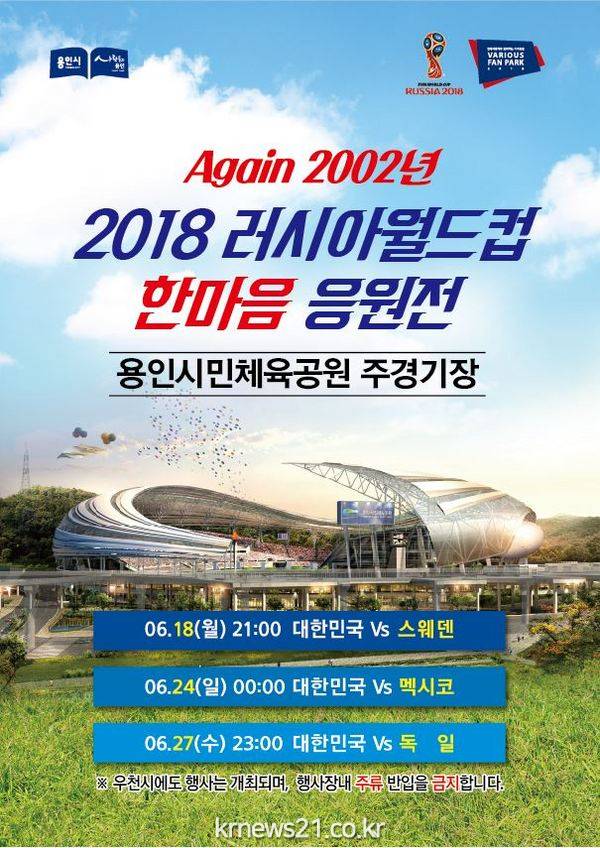용인시는 월드컵 본선에 진출한 대한민국 국가대표팀의 선전을 기원하고 시민화합의 장을 마련하기 위해 용인시민체육공원 주경기장에서 전광판과 무대를 중심으로 다채로운 행사가 펼쳐지는 응원전을 개최한다.