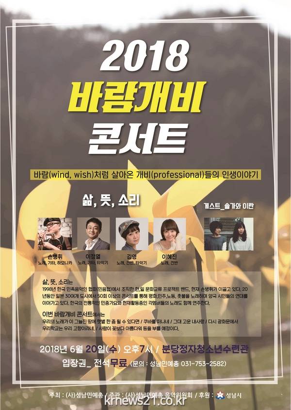 2018 바람개비 콘서트는 ‘삶, 뜻, 소리’특집으로 진행됩니다. '삶, 뜻, 소리'라고 불리는 이 밴드는 1998년 일본의 합창운동단체인 '우타고에'의 창립 50주년을 기념하여 그 축하무대에 서기위해 '민족 음악인협회'에서 만든 한, 일 문화교류 프로젝트 밴드입니다. 1998년 한국에서 결성해서 일본에서 왕성한 활동을 하고 있는 한, 일 문화교류 프로젝트 밴드 ‘삶, 뜻, 소리’를 통해 우리가 사랑했던 운동가요와 살아왔던 시대, 그리고 그 민중가요의 현재모습과 음악인들의 모습까지 느낄 수 있습니다.