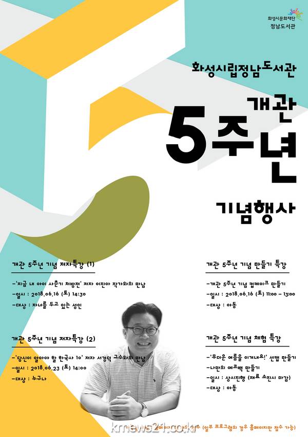 또 6월 23일에는 한국문화홍보전문가 서경덕 교수가 ‘당신이 알아야 할 한국사 10’을 주제로 강연을 펼친다. 화성시 정남도서관 이경화 팀장은 “개관 5주년을 맞아 많은 지역주민들이 문화혜택을 누릴 수 있도록 준비했다.”며 “평소 만나기 힘들었던 다양한 프로그램을 선보이는 만큼 많은 시민들이 찾아와 다함께 지역 도서관의 개관 5주년을 축하하고, 함께 즐길 수 있기를 바란다.”고 전했다.
