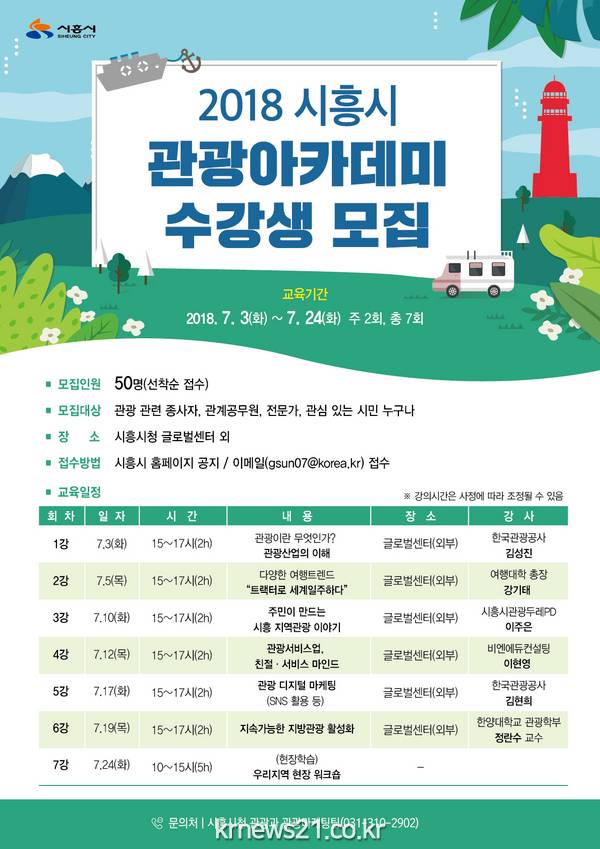 시흥시는 관광역량 강화 및 관광 네트워크 구축을 위해 7월 3일(화)부터 24일(화)까지 관광아카데미를 운영할 예정이다. 이에 관광에 관심 있는 시민을 대상으로 수강생 50명을 선착순으로 모집한다.