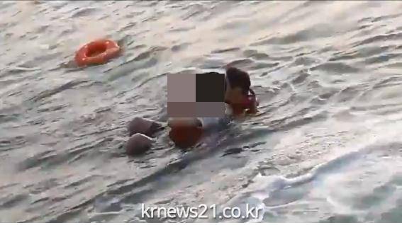 살려달라며 허우적 거리는 것을 발견하고 인명 구조장비를 지참한 해양경찰관이 직접 바다에