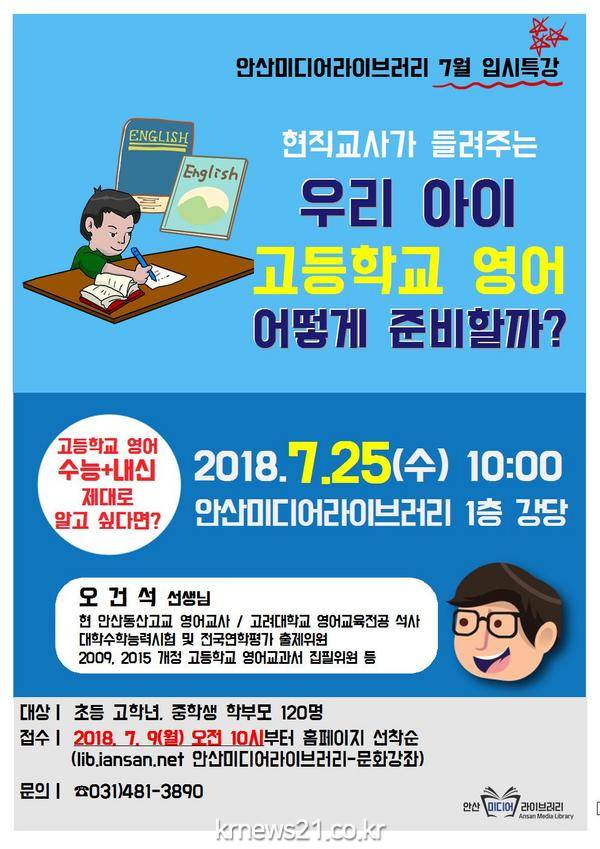 안산미디어라이브러리는 다음달 25일 안산미디어라이브러리 1층 강당에서 초등 고학년, 중학생 자녀를 둔 학부모를 대상으로 ‘우리 아이 고등학교 영어공부법’ 강연을 진행한다.