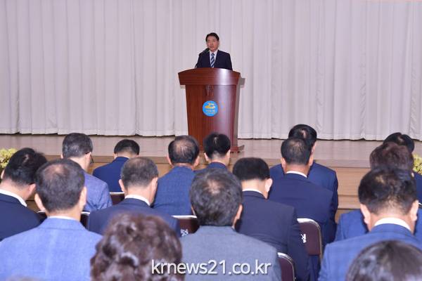 △2일 오전 권오봉 여수시장이 시청 회의실에서 취임선서 후 공무원들에게 당부의 말을 하고 있다.