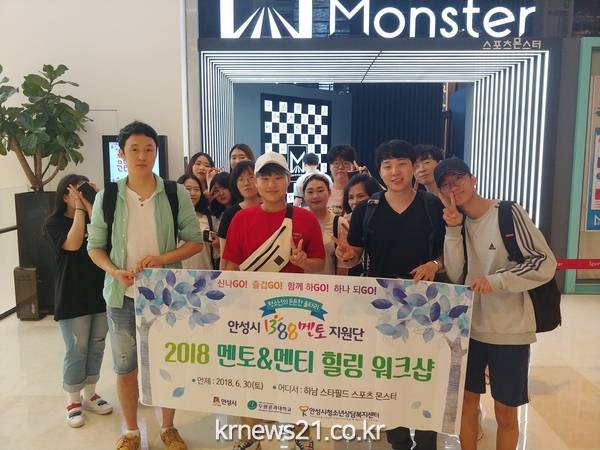 안성시 청소년상담복지센터(센터장 장은정)는 지난 6월 30일 하남 스포츠몬스터에서 대학생 멘토 및 청소년 멘티 15명이 참석한 가운데 ‘2018. 1388멘토 지원단 멘토&멘티 힐링워크샵’을 실시했다.
