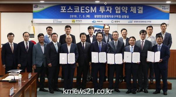 여수시에 따르면 5일 오전 광양경제자유구역청에서 여수시와 전라남도, 광양시, 광양만권경제자유구역청, ㈜포스코 ESM이 율촌산단에 5700억 원을 투자하는 협약을 체결했다.