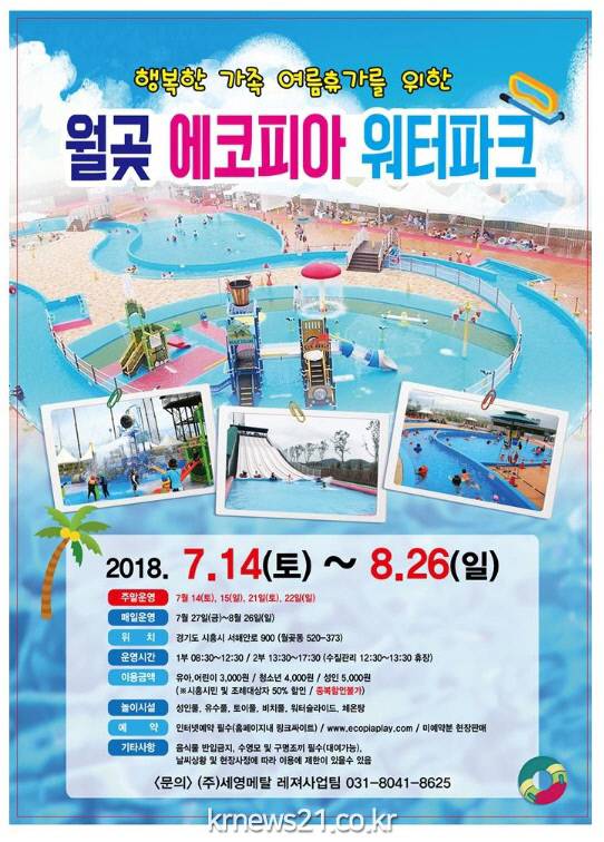 시흥시는 시흥월곶에코피아 상부 워터파크를 오는 14일부터 8월 26일까지 개장한다.