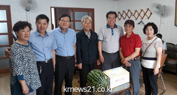 △지난 11일 여수시 서강동 주민자치위원들이 관내 경로당을 방문해 무더위 건강관리를 당부하고 수박 등 간식을 전달하고 있다.