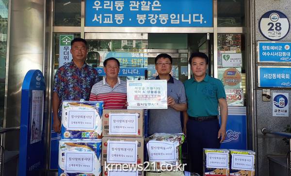 △지난 16일 여수 참사랑봉사단이 서강동 주민센터에 취약계층을 위한 50만 원 상당의 쌀과 가정 용품을 전달하고 있다.