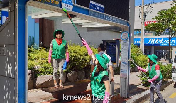 △지난 13일 여수시 시전동 새마을협의회원과 부녀회원들이 관내 버스정류장을 청소하고 있다. 협의 회원과 부녀회원 20여 명은 이날 정류장 10곳을 청소했다.