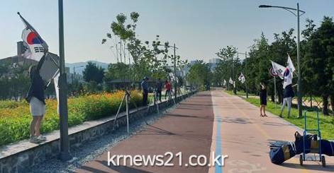 주민자치위원들은 이날 미평공원 1㎞ 구간에 태극기 50여 개를 달고 시민들에게 태극기 달기 운동 참여를 홍보했다.