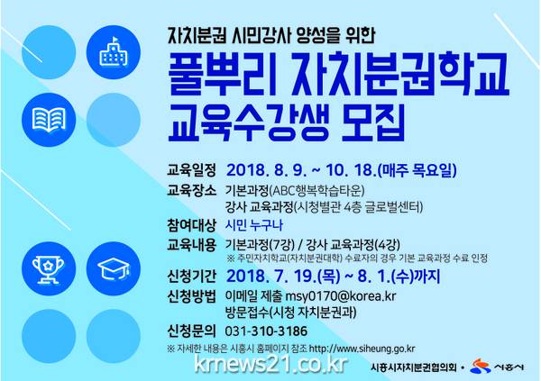 시흥시(시장 임병택)는 19일부터 8월 1일까지 2주 동안 ‘풀뿌리 자치분권학교’ 수강생을 모집한다.