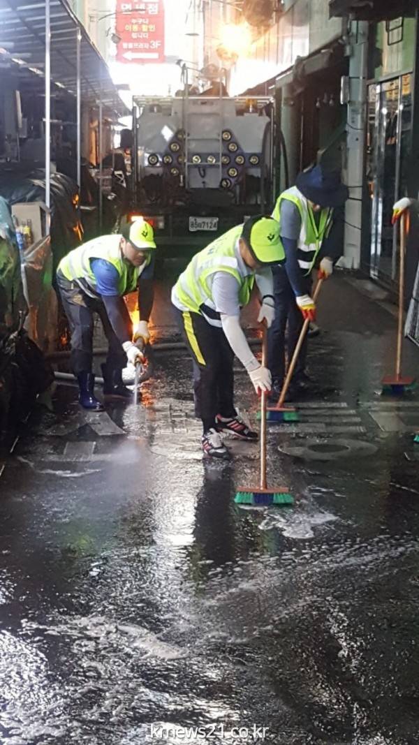 ▲ (사진=대구 중구청)대구 중구(구청장 류규하)는 서문시장을 찾는 내방객들이 시원하고 깨끗한 분위기에서 장을 볼 수 있도록 24일부터 27일까지 오전 6시~오전 8시까지 시장 일대 대대적인 물청소를 실시한다.
