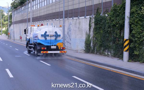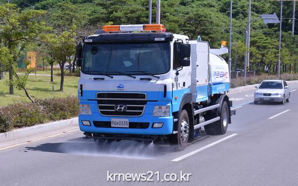 △연일 30도를 넘나드는 폭염이 이어지는 가운데 25일 여수시가 운영하는 16톤급 살수차량이 도로에 물을 뿌리며 도심 열기를 식히고 있다. 물 뿌리기 작업은 뜨거워진 도로를 식혀 아스팔트 변형을 막고 미세먼지 비산을 막는 효과도 있다.