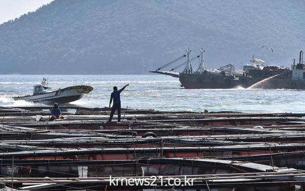 △26일 오후 적조가 발생한 여수 월호 해역에서 황토 살포 작업이 실시되고 있다.