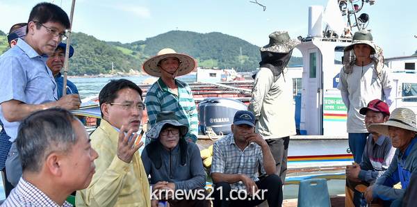 △26일 오후 권오봉 여수시장이 여수 월호 해역 가두리양식장을 방문해 어업인들과 적조 대책을 논의하고 있다.