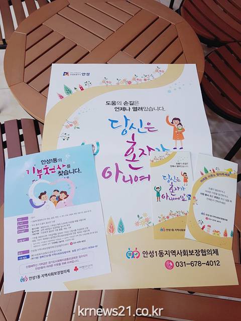 '당신은 혼자가 아니예요.'라는 타이틀로 리플릿 및 전단지 2000부, 포스터 50부를 제작했다. 이 리플릿은 안성1동지역사회보장협의체가 복지 허브화 정책실현으로서 긍정적인 변화와 주민들의 참여를 이끌어 내기 위해 올해 처음 제작했다.