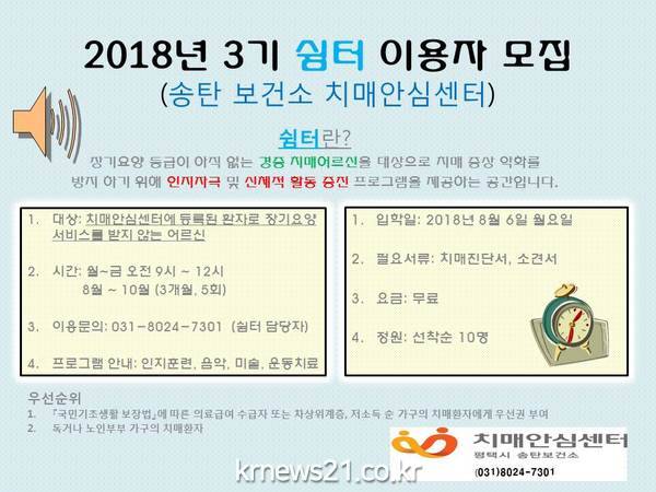 2017년 12월 치매안심센터 개소 이후, 올해 2월부터 송탄 치매안심센터에서는 경증치매환자를 위한 ‘쉼터 프로그램’을 진행하고 있다.