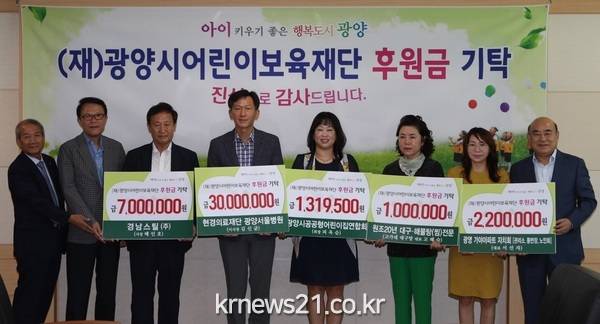 지난해 7월 전국 최초 민․관 협력으로 설립된 (재)광양시어린이보육재단(이사장 황재우) 에 각종 단체와 기업, 시민들의 자발적인 후원금 참여가 계속 이어지고 있다.
