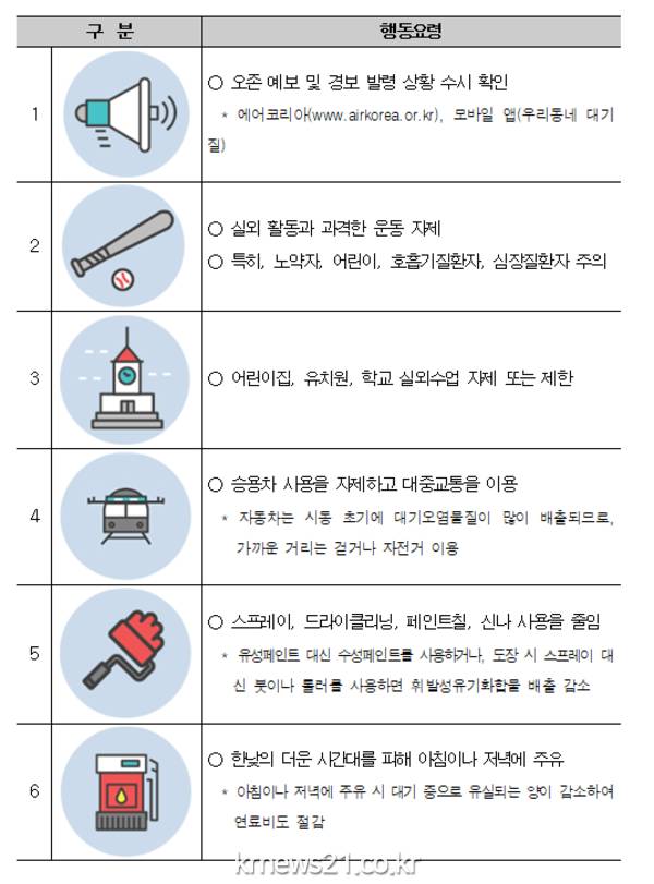 "건강보호를 위해 특히 어린이, 노약자, 호흡기·심장질환자는 환경부 에어코리아 누리집이나 '우리동네 대기질' 앱 등에서 제공되는 오존 예보와 경보를 참고하여, 오존 농도가 높을 때 실외활동을 줄이는 등 주의할 필요가 있다"라고 말했다.