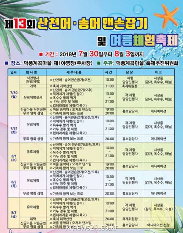 오는 7월 30일 (월)부터 8월 3일 (금)까지 5일간 덕풍계곡마을 제1야영장 및 덕풍계곡 일원에서 제13회 산천어·송어 맨손잡기 및 여름체험축제가 펼쳐진다.