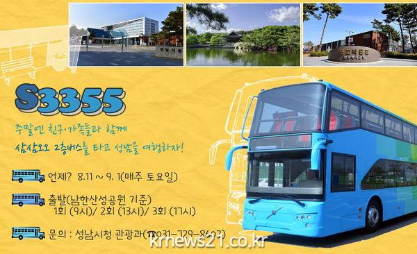 성남시는 오는 8월 11일부터 9월 1일까지 4차례의 토요일에 시내 주요 명소 15곳 정류장을 들리는 2층 관광버스를 시범 운영한다.