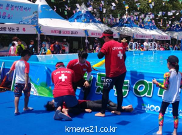 이날 교육은 대구시설공단에서 운영 중인 신천물놀이장을 찾은 어린이들과 부모님들을 대상으로 물놀이 사고 발생 시 익수자 구조 및 응급처지 과정 등을 재현하였는데, 119시민수상구조대와 함께 교육이 이루어져 긴급상황에 대해 체계적인 교육이 실시되었다.