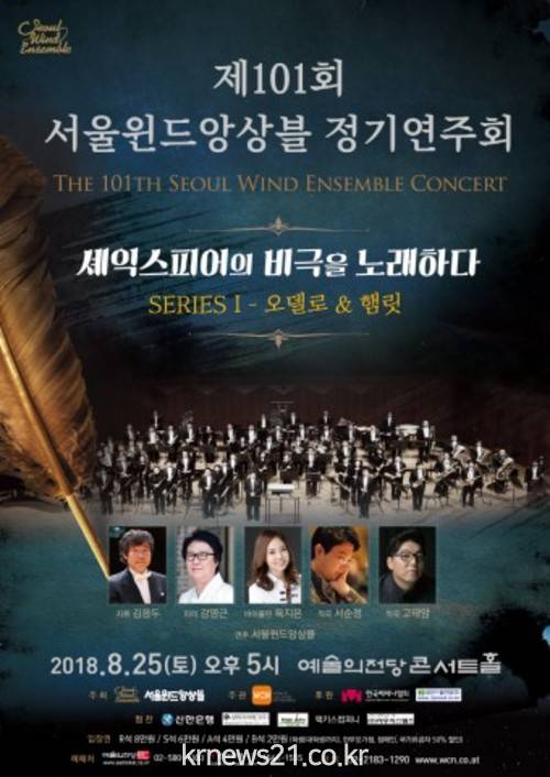 서울윈드앙상블이 제101회 정기연주회를 8월 25일 일요일 오후 5시 서울 예술의전당 콘서트홀에서 개최한다. 관악기의 완벽한 하모니로 흠 없이 아름다운 음악을 완성해내는 서울윈드앙상블은 이번 공연을 <셰익스피어의 비극을 노래하다>라는 주제로 꾸밀 예정이다.