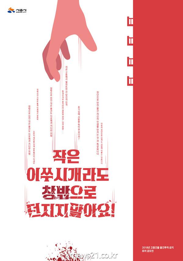 시흥시(시장 임병택)는 고층건물 물건 투척에 대한 사회적 경각심을 일깨우고 주민들의 안전의식을 고취하고자 지난 2일 홍보 포스터를 관내 공동주택 및 학교에 배포했다. 이번 포스터는 지난 6월 관내 초·중·고등학생을 대상으로 실시한 표어 및 포스터 공모전수상작으로 구성됐다.