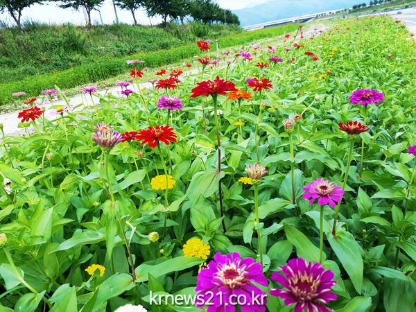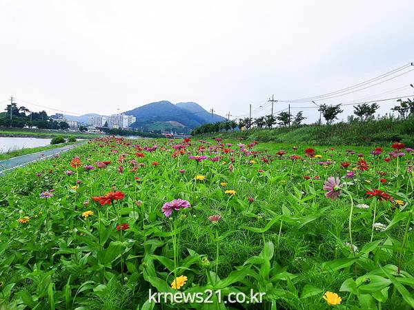 서천변 하천을 따라 1.4km, 5만6천㎡ 꽃단지에 조성된 백일홍은 빨강, 노랑, 자주 등 화려한