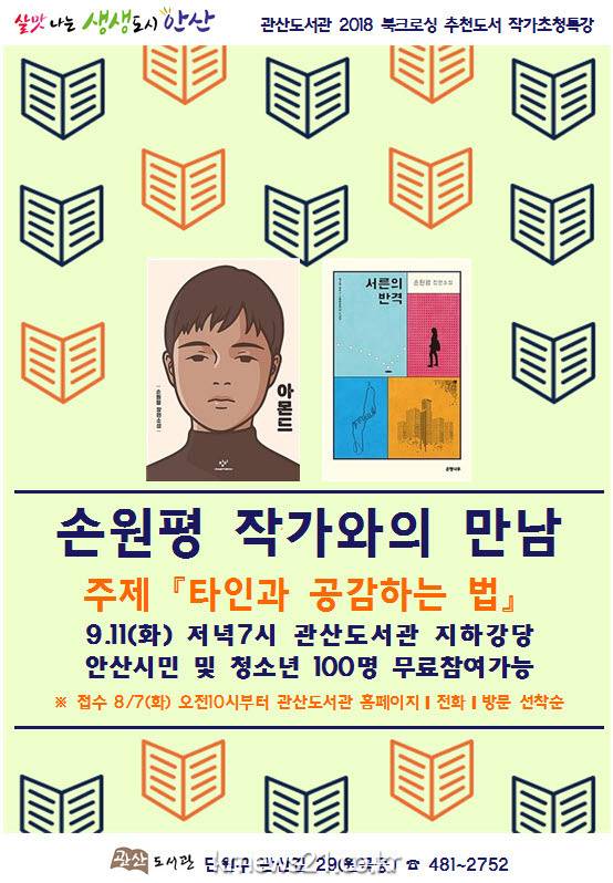 안산시 관산도서관(관장 정순미)은 9월 독서의 달을 기념해 도서 ‘아몬드’와 ‘서른의 반격’의 손원평 작가를 초청해 9월 11일 저녁 7시 특강을 진행한다.