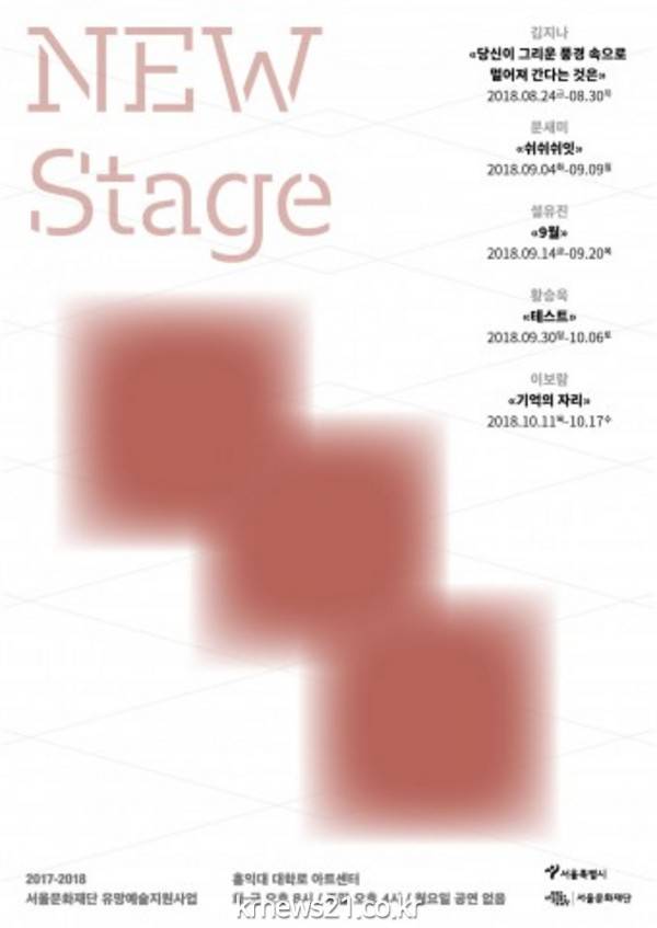서울문화재단(대표 직무대행 서정협)은 신진 연출가와 극작가의 작품 개발부터 무대에 오르기까지 전 과정을 지원하는 유망예술지원사업 ‘뉴스테이지(NEWStage)’에 선정된 예술가 5명의 신작이 24일(금)부터 10월 17일(수)까지 홍익대 대학로 아트센터 소극장 무대에 차례로 오른다고 10일 밝혔다.