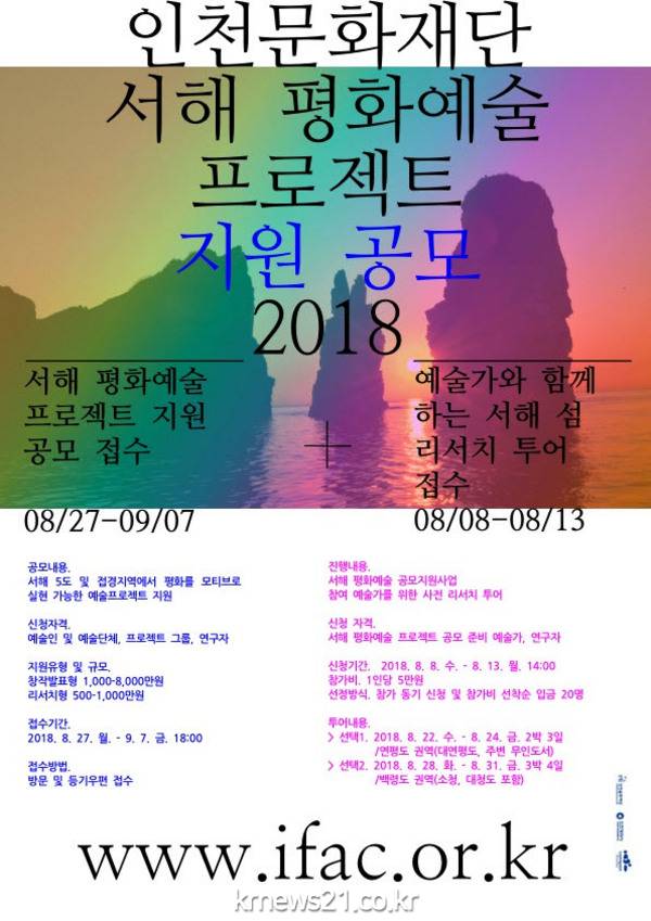 인천문화재단(대표이사 최진용)이 9월 7일(금)까지 2018 서해 평화예술 프로젝트 지원사업의 참여 예술가를 공모한다.