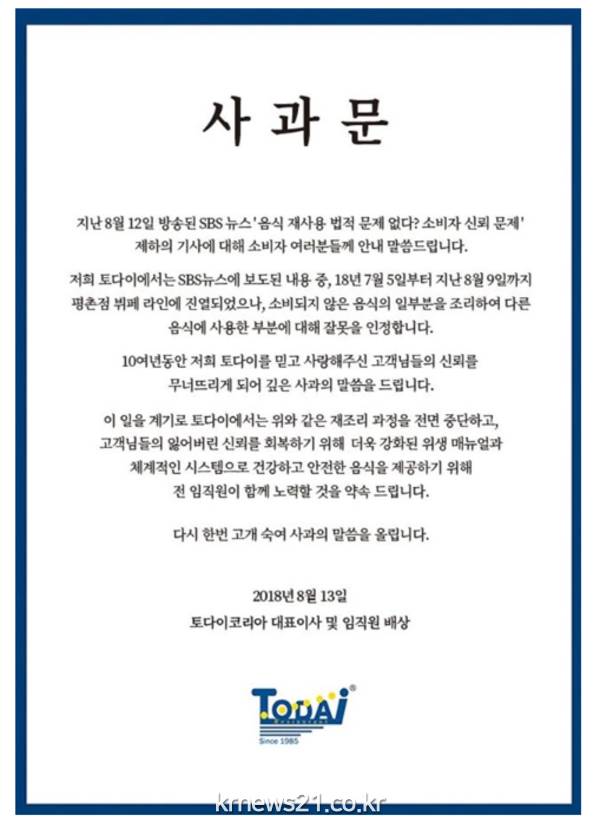 이어 "이 일을 계기로 토다이에서는 위와 같은 재조리 과정을 전면 중단한다"며 "잃어버린 신뢰를 회복하기 위해 더욱 강화된 위생 매뉴얼과 체계적인 시스템으로 건강하고 안전한 음식을 제공하기 위해 전 임직원이 함께 노력할 것을 약속한다"고 덧붙였다.