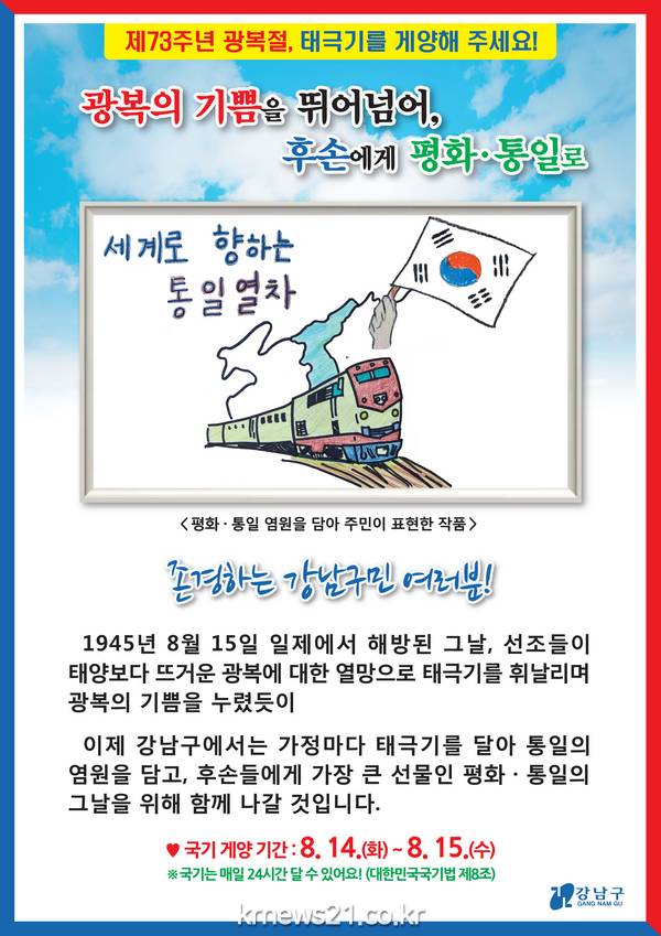 ▲ (사진=강남구청)‘기분 좋은 변화, 품격 있는 강남’을 비전으로 제시한 강남구(구청장 정순균)는 제73주년 광복절을 맞아 자율적인 태극기 달기 운동을 펼친다.
