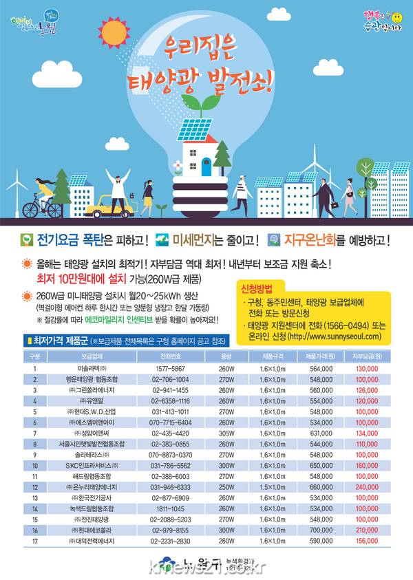 설치를 원하는 주민은 태양광 보급업체 또는 태양광 지원센터, 동 주민센터 등에 신청하면 된다. 설치된 미니태양광은 올해 태양광 보급업체 뿐만 아니라 신설된 태양광 지원센터를 통해서도 5년내 고장이 나면 무상 수리를 받을 수 있으며 소모품인 인버터만 교체해주면 20년 동안 매월 전기료를 아낄 수 있게 된다.
