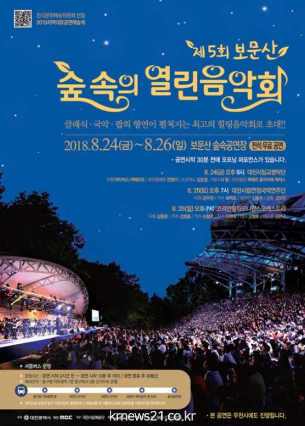 대전시 관계자는“무더위에 지친 시민들이 보문산 야외무대에서 음악과 함께 힐링하는 숲속의 열린음악회에 온 가족이 특별한 나들이를 와서 고품격 무대를 즐겨보길 바란다”고 말했다.