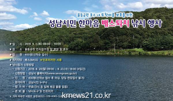 성남시는 오는 9월 1일 분당구 율동공원 호수에서 ‘성남시민 한마음 배스퇴치 낚시 행사’를 연다.