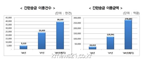 금융감독원이 14일 발간한 ‘전자금융업자의 간편 송금 거래 현황 및 시사점’ 자료에 따르면 지난해 간편 송금업 이용금액은 총 11조9541억원으로 2016년(2조4413억원)보다 389.7% 급증했다.