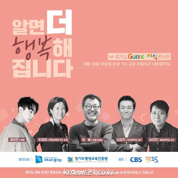 경기도평생교육진흥원과 경기도는 8월 23일 오후 7시 고양 아람누리 아람음악당(하이든 홀)에서 ‘알면 더 행복해집니다.’라는 주제로 ‘2018년 제1회 경기도 지식(GSEEK) 콘서트’를 개최한다.