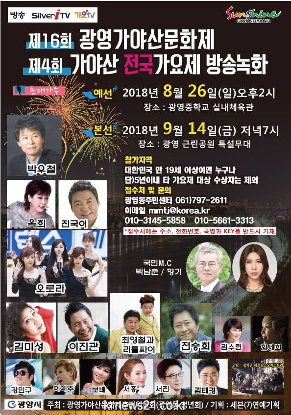 광양시 광영동은 오는 8월 25일까지 ‘제4회 가야산 전국가요제’ 참가 신청자를 받는다고 밝혔다.