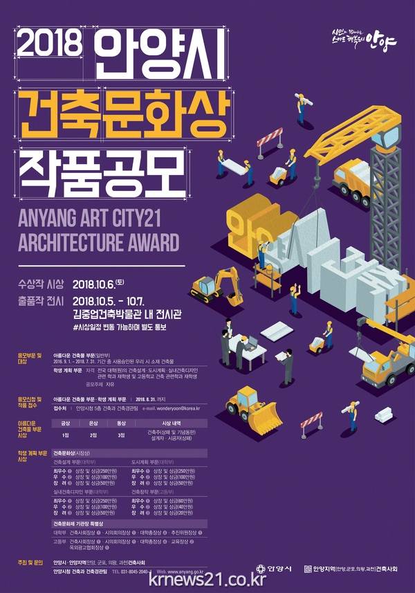 안양시(시장 최대호)는 이번 달 31일까지 건축문화상 작품을 공모한다고 밝혔다.