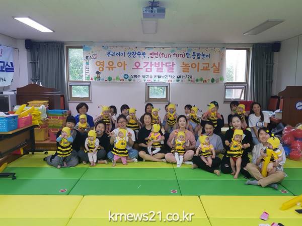 매주 화요일에 열리는 오감발달 놀이교실은 6~10개월 영유아와 엄마를 대상으로 15팀을 구성해 영아의 인지, 정서, 언어, 사회성 등 발달 단계에 맞춰 오감을 자극해 유아의 신체건강과 두뇌발달을 촉진하는 통합 놀이 교육이다.