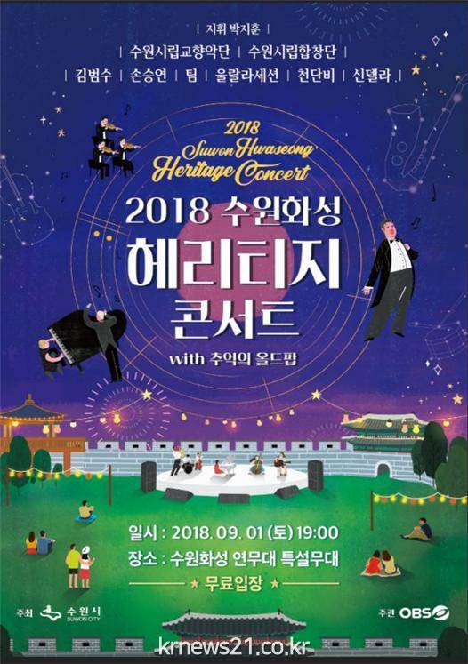 9월의 첫날 저녁 7시 수원화성 연무대 특설무대에서 열리는 ‘수원화성 헤리티지 콘서트 with 추억의 올드 팝’에는 수원시립교향악단, 수원시립합창단, 가수 김범수, 손승연, 팀, 울랄라세션, 천단비, 성악가 신델라 등이 출연한다.