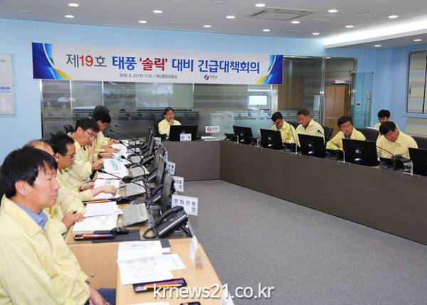 ▲ (사진=영양군청)23일을 전후해 제19호 태풍 ‘솔릭’이 한반도를 관통할 것으로 전망됨에 따라 영양군(군수 오도창)은 시설 및 인명 피해 최소화를 위하여 군수 주재로 8월 22일(수) 오전 11시 30분 영양군청 재난종합상황실에서 태풍 대비 긴급대책회의를 개최했다.