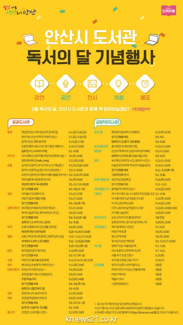 안산시 공공 및 공립 작은 도서관 29개소에서는 9월 독서의 달을 맞아 작가와의 만남, 인문학 강연, 문화공연, 체험프로그램, 전시 등 다양한 독서문화행사를 진행한다.