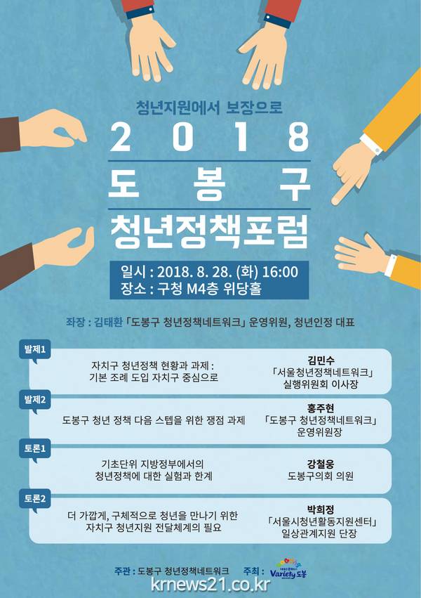 ▲ (사진=도봉구청)청년정책사업 추진 2년차를 맞아, 청년정책 및 활동에 대한 사회적 공감대를 조성하고, 구의 청년정책 발전방향 모색을 위해 오는 8월 28일 오후 4시 구청 M4층 위당홀에서 ‘2018 도봉구 청년정책 포럼’을 개최한다.