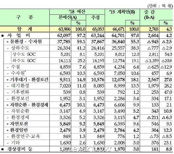 2019년도 환경부 예산안은 전년도 6조 3,906억 원 대비 2,765억 원(4.3%) 증액된 6조 6,671억 원, 기금안은 4대강 수계기금 9,031억 원(△1.0%), 석면피해구제기금 175억 원(13.7%) 등 전년도 대비 68억 원(△0.7%) 감액된 9,206억 원으로 편성되었다.