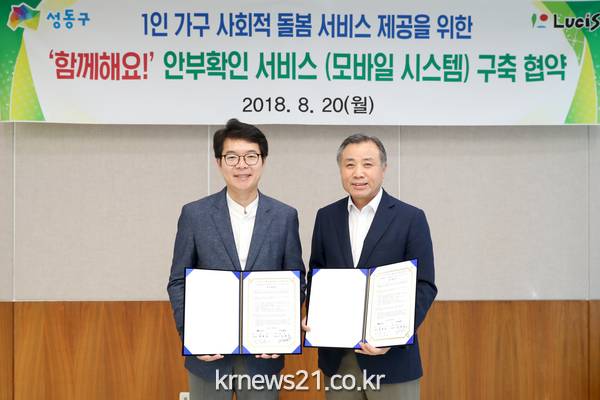 구는 1인 가구 고독사 예방 및 사회적 고립가구 안정망을 확충하기 위해 지역 내 IT기업 ㈜루키스와 업무협약을 맺고 우선 8월 27일부터 40세~59세 및 75세 이상 1인 가구에 대해 전수조사를 실시한다. 이 중 SKT가입자에 한해 9월20일까지 서비스 신청을 받고, KT, LG 등 타 통신사는 12월부터 신청을 받을 예정이다. 대상자도 60세~74세 및 중장년 1인가구로 점차 확대해 나갈 계획이다. 성동구의 1인 가구 수는 7월 말 기준 53,766명으로 전체가구의 39%에 달한다. 그중 40세~60세 미만이 16,749명으로 1인 가구 중 31%로 가장 많다.