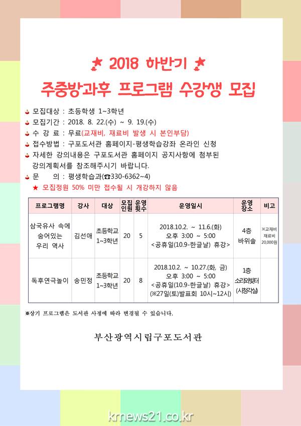 ▲ (사진=부산광역시 교육청)부산광역시립구포도서관(관장 권영식)은 오는 10월 2일(화)부터 11월 6일까지 초등 1~3학년 학생 40명을 대상으로 2018년 하반기 주중방과후 프로그램을 운영한다.