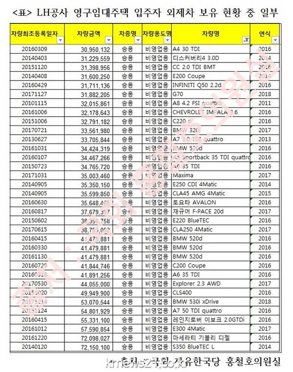 사례별로 보면 어떤 입주자는 차량가액이 7215만원인 벤츠(연식 2014)를 보유하고 있었으며, 또 다른 입주자는 차량가액이 7209만원인 마세라티(연식 2016년)를 소유하고 있는 것으로 나타났다.
